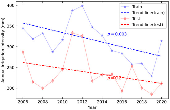 Despite the strong climatic control on the irrigation amount interannual variability (e.g., higher irrigation in drought years), irrigation water use has overall decreased in the Kansas HPA during the study period. The declining trend is primarily due to irrigation management policy and irrigation technology changes in recent years [40,72]. Since 2006, most Kansas HPA irrigation fields have adapted central pivot irrigation to central pivot with Low Energy Precise Application (LEPA). The LEPA technology can reduce wind drift-caused ET, therefore, improving the irrigation efficiency and reducing the irrigation intensity (or irrigation volume per irrigated area) required for crop growing [73]. Figure 8 shows the spatially averaged irrigation intensity during the study period for the training (western) and test (eastern) portions of the study area. It was calculated by dividing the total irrigation amount of each grid with the irrigated acreage in that grid (as opposed to the grid size, 36 km2, used to calculate the irrigation depth) and taking the average across the Kansas HPA. Both the irrigation amount and irrigated acreage are from the WIMAS dataset.