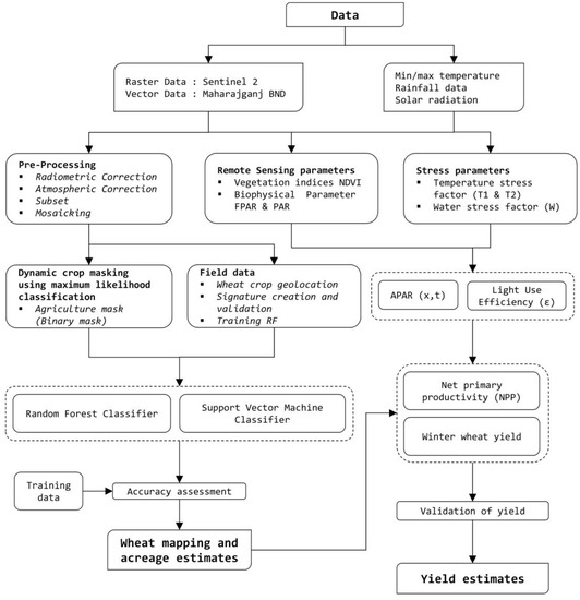 In this section, we first discuss the methods related to the calculation of acreage, followed by the estimation of yield. The overall methodology is shown in Figure 3.