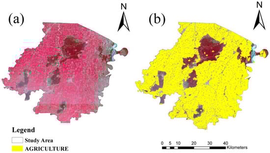(a) Sentinel 2A cropped image of the study area that was masked to extract the agricultural land. The red tone is the tone of vegetation observed in false color composite (FCC) (b) Agriculture only classification product with the symbology yellow depicting agriculture (binary map extracted using the maximum likelihood classifier).