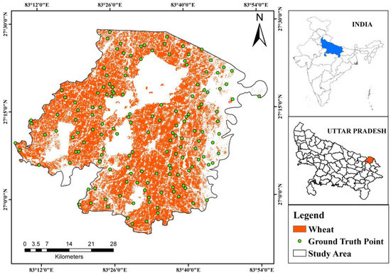 The present study has been carried out in Uttar Pradesh, India. Agriculture in India plays a strategic role because the sector is the cornerstone of the country’s economy [20]. Approximately 19.9% of the GDP of India is based on agriculture, which employs approximately half of the country’s labor force [21]. Wheat is mainly a winter crop (Rabi season crop), a vital food grain, and in Eastern India, the staple food is wheat-based. Thus, most foods are based on wheat flour, and its assessment is therefore very significant to monitor [22,23,24]. Uttar Pradesh is India’s major wheat-growing state and contributes 32% of the country’s wheat production from just 7.34% of the country’s total geographical area. Economic policies related to agriculture and prices of yield are affected by the accuracy and speed of crop yield estimates [25,26]. The crop yield is estimated to play an essential role in economic development. With precise crop yield estimations, decision makers can decide whether production conditions exceed or fall below and, hence, can make timely export and import decisions [27]. Due to population growth, the demand for planning at micro-levels is increasing, especially the need for ensuring crops, which increases the demand for field-level production estimates [28].