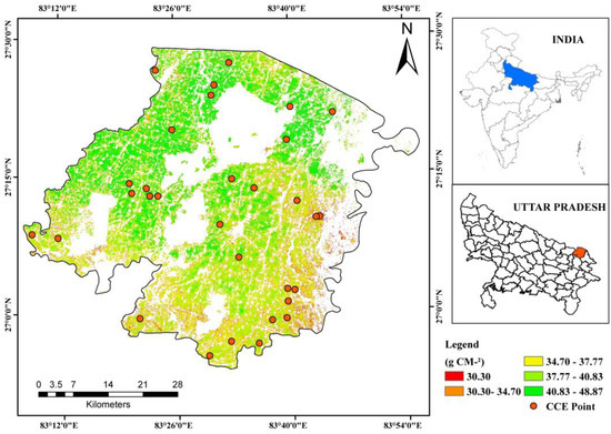 We used Sentinel 2A imagery (Bands 2, 3, 4, and 8, each 10 m spatial resolution, dated 21 May 2021) for calculating the winter crop (Rabi, winter-sown, and summer harvested) wheat acreage. The images were corrected for atmospheric corrections and preprocessed into Orth photo (TOA) and the bottom same orthodontic reflection (BOA) for removing the atmospheric errors and converted into 1C product corrected product. It was ascertained that the images used in the analysis must cover the stem extension (January), heading (February), flowering, and early ripening (March) stages of the wheat crop. The march image was used for the optimum acreage and yield calculations, whereas the earlier images were analyzed for fPAR variations. The mosaicking was performed on T44RQR and T44RQQ Tile of Sentinel-2A that covered the study area. We used the ERDAS Imagine 2014 software for all the image processing and GIS analysis [34]. Since the image of the study area was available in various scenes, we performed mosaicking within the ERDAS platform. For CASA, mean daily temperature, sunshine hours, daily precipitation, and average solar radiation were downloaded for the study area from the National Aeronautics and Space Administration’s (NASA) (https://giovanni.gsfc.nasa.gov/giovanni/, (accessed on 25 April 2021)) website [35]. The Government of India’s census department provided the state and district boundaries of Uttar Pradesh and Maharajganj District. For validating the acreage generated from SVM and RF, we conducted extensive ground-truthing and performed the accuracy assessment using the user’s accuracy, producer’s accuracy, and the kappa coefficient [36,37], and took about 120 ground-truthing points (randomly distributed, covering almost whole of the district) for this purpose. We used Garmin GPS explorer to record the GPS locations [38] (Figure 2). Daily average temperature, sunshine data, daily rainfall, and average solar energy data used here were downloaded from the NASA Power Data Access Viewer (https://power.larc.nasa.gov/data-access-viewer/ (accessed on 25 April 2021)). The processing included monthly averaging of temperature, solar radiation data, and precipitation data.