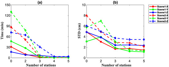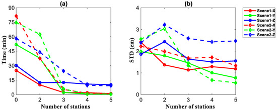 - As the quantity of 5G base stations participating in the positioning solution increases, the convergence time and the STD of the errors after convergence both tend to decrease. The beneficial effect brought about by the participation of 5G base stations in positioning is also evident with a smaller number of visible satellites. In particular, when a single BDS system cannot converge within 1 h or when there is a large post-convergence error in some cases, the involvement of 5G base stations can significantly speed up convergence and achieve better post-convergence positioning accuracy.