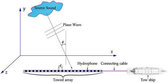 Towed array sonars with a large number of acoustical sensors and large apertures are widely used for underwater weak signal detection [1], achieving high spatial resolution and signal amplification. Geometrically, a towed array sonar is a long flexible hose attached to the ship or the underwater vehicle with a connecting cable [2], as shown in Figure 1. During the motion of the tow vehicle, the sensors are thus subjected to hydrodynamic forces and under constant motion, and disorder of the array shape appears.