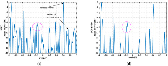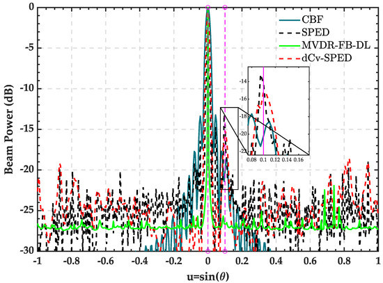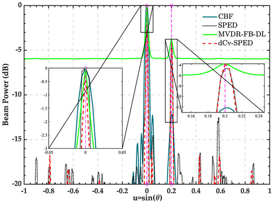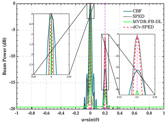 In the first simulation, the presence of signals with a strong line spectrum was considered first to examine the false alarm suppression and weak target detection ability of the dCv-SPED algorithm. Two ship noise signals arriving at the directions of 0 ° [ u = sin ( 0 ° ) = 0 ] and 11.54 ° [ u = sin ( 11.54 ° ) 0.2 ] were generated. The SNRs of the two targets were 10 dB (at 0 ° ) and 0 dB (at 11.54 ° ). Figure 2 shows the spatial spectra estimated by CBF, SPED, MVDR-FB-FL, and dCv-SPED. In order to generate the same dynamic range, all spectra plots were normalized with the max value set at 0 dB. As shown in the figure, for the strong signal at u = 0 , the beamwidth of the MVDR-FB-DL algorithm had the highest resolution, and its beamwidth was 0.28 ° (measured at −3 dB point), followed by the dCv-SPED with a beamwidth 1.10 ° . For the weak signal at u = 0.2 , the dCv-SPED algorithm had the highest resolution, and its beamwidth was 1.24 ° , followed by SPED with a beamwidth at 1.58 ° . The dCv-SPED generated the highest dynamic range (target beam power in dB minus noise floor power in dB) of the weak target spatial spectra at u = 0.2 , and its dynamic range was 18 dB , followed by SPED with a dynamic range of 15.5 dB . Compared with the SPED algorithm, dCv-SPED effectively suppressed the false peak caused by the SPED algorithm.