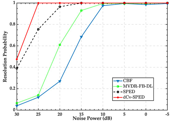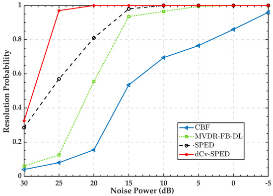 Figure 4. Resolution probability vs. noise power for the CBF, SPED, MVDR-FB-FL, and dCv-SPED.