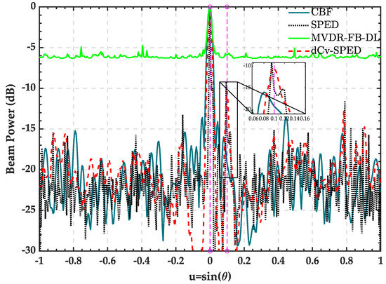 Figure 7 shows the spatial spectra estimated by the four algorithms under array perturbations. As the figure shows, the proposed algorithm provided the highest resolution for the spatial spectrum estimation of both strong and weak targets, and its beam width was 1.53 ° and 1.81 ° , respectively. When the array was perturbed, the beam widths of SPED for the strong and weak targets were 1.56 ° and 1.87 ° , close to those of the proposed algorithm, but SPED produced strong false alarms at approximately u = 0.2 and u = 0.6 . Due the array perturbations, the dynamic range and spectra resolution of the MVDR-FB-DL declined sharply. The explanation for this is that the MVDR was affected by the array perturbations, although the improved algorithms of the forward–backward averaging and diagonal loading were adopted to obtain spatial spectra, the cost was a decrease in the dynamic range, which led to the reduction in the weak target detection effect.