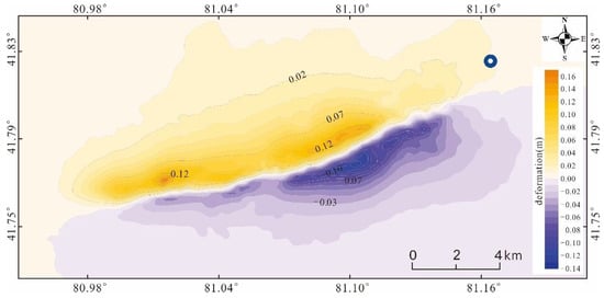 In this paper, DInSAR technology is used to extract coseismic deformation field and coherence coefficient diagram, as shown in Figure 3. This experiment is implemented by ENVI SARscape software. We used the radar image on the 13 March 2021 as the master image for registration, and the image on the 25 March 2021 is registered with it. The registration accuracy can generally reach 1/8 pixel. Two images are processed by differential interference, the topographic phase and flat phase are removed by using high-precision external DEM and orbit information. This study carries out adaptive filtering on the interferogram to overcome the random noise. According to the differential interferogram, the whole deformation field is approximately ellipsoidal, accompanied by two concentric rings, which is roughly divided into eastern and western parts. The interference fringes of the coseismic deformation are smooth and visual, indicating that the earthquake caused surface deformation. In addition, the interference fringes are continuous and each fringe represents a displacement of 2.8 cm []. The next step was to acquire the absolute deformation of the surface, based on the Minimum Cost Flow method [] that can unwrap the phase of the coseismic deformation interferogram and obtain the seismic deformation field. After orbit refining and re-flattening, the differential unwrapping phase is converted into the radar line-of-sight (LOS) directional deformation field. Figure 4 shows the coseismic deformation field after geocoding.