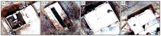 Examples of UAV images. (a) Collapsed building; (b) Severely damaged building; (c) Lightly damaged building; (d) Undamaged building.