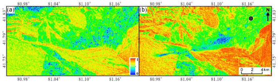 Coherent change detection mainly uses the coherence map obtained by the DInSAR technology mentioned above to obtain the building damage area caused by earthquakes. The specific methods are as follows: in obtaining the coseismic deformation field, coherence map is also obtained. The same method and software are used to calculate the coherence map of Sentinel-1A radar data from the two images before the earthquake []. Figure 6a shows the pre-seismic coherence coefficient diagram, and Figure 6b shows the coseismic coherence coefficient diagram. The value range of coherence coefficient diagram is 0 to 1. The closer to 1, the higher the coherence. The closer to 0, the lower the coherence. Between two image acquisitions, high coherence means that the ground target remains unchanged, while low coherence means that the ground object has changed. In this study, the part with coherence value lower than 0.37 is defined as low coherence region. The areas with coherence lower than 0.37 in Figure 6a are basically attributed to vegetation, and the areas with coherence lower than 0.37 in Figure 6b are basically attributed to surface deformation caused by the Baicheng earthquake.