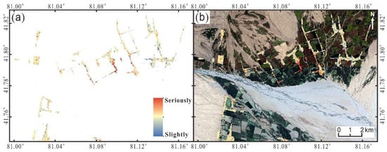Each of the methods mentioned has its advantages in the identification of earthquake disasters in Baicheng. Coherent change detection and polarimetric decomposition can be combined to complement each other, thereby improving the accuracy of the assessment results. The decorrelation of phase coherence usually indicates the ground changes. The greater the degree of decorrelation is, the more obvious the ground changes and the greater the possibility of building collapse [,]. However, coherence is highly dependent on both the temporal and spatial baseline. Polarimetry information is sensitive to the properties of ground targets, such as dielectric constants, physical properties, geometry and orientation. It can provide richer information for understanding the backscattering mechanisms of ground targets. However, Sentinel-1 provides dual-polarization rather than full-polarization, and the resolution is relatively low []. Therefore, this study combines the two methods based on ArcGIS software. Equation (17) was used to calculate the two results, and the damage distribution diagram of buildings was obtained, as shown in Figure 12a. Figure 12b shows superimposed optical image and surface deformation results on Figure 12a. We found that the buildings were seriously damaged between the uplift area and the subsidence area. Due to the large surface changes, there is decoherence in this area. To some extent, this proves the accuracy of building earthquake damage information extraction.
