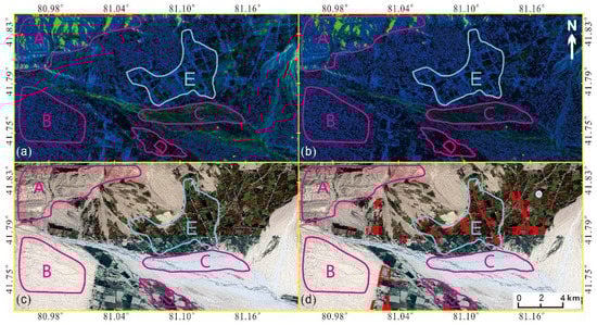 For the polarimetric decomposition, the scattering information under different polarization modes can be extracted. It has a strong anti-interference ability, which is conducive to the decomposition and analysis of the scattering mechanism []. It provides favorable data support for the identification and detection of building collapse and damage. Unfortunately, Sentinel-1A data are not obtained in full-polarization mode, but in dual-polarization VV + VH mode. Therefore, many decomposition methods for fully polarized data cannot be used for these data []. In this paper, SNAP software is used to reflect the scattering characteristics of buildings in the C-band radar images by H/A/alpha polarization decomposition. Figure 10a,b show the decomposition processing results before and after the earthquake, respectively. Figure 10c is the corresponding optical image obtained using Google Earth Engine (https://earthengine.google.com/), and accessed on 10 October 2021. The buildings in the study area are sparsely distributed. For the convenience of explanation, we superimposed the red building area on the basis of Figure 10c, as shown in Figure 10d. The polarization decomposition results consist roughly of several regions, labeled with capital letters (from A to E). A to D represent mountains, sandy land, rivers and farmland, respectively. The light part in E represents the building area, while the dark part represents the farmland. The damage assessment map of the building based on polarization decomposition is obtained through subtraction band operation, as shown in Figure 11. According to the ground survey, the overall accuracy is 82%, the Kappa coefficient is 0.62, the correct identification accuracy of the collapsed and severely damaged areas is 67% and that of slightly damaged and undamaged areas is 92%, as shown in Table 3.