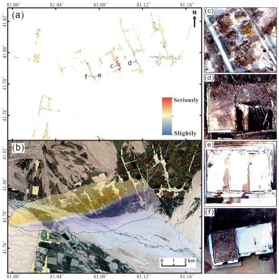 Building damage assessment map. (a) Building damage assessment map based on the combination of coherent change detection and polarization decomposition; (b) Overlay of Figure 12a based on surface deformation results and optical image obtained using Google Earth Engine (https://earthengine.google.com/), and accessed on 10 October 2021. The dashed black line indicates the threshold of the LOS deformation field. (c–f) images are taken from UAV. (c) Field investigation image corresponding to area c (collapsed building) in Figure 12a; (d) Field investigation image corresponding to area d (severely damaged building) in Figure 12a; (e) Field investigation image corresponding to area e (lightly damaged building) in Figure 12a; (f) Field investigation image corresponding to area f (undamaged building) in Figure 12a.