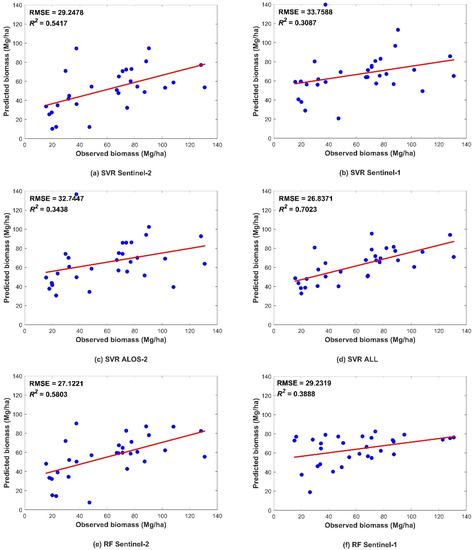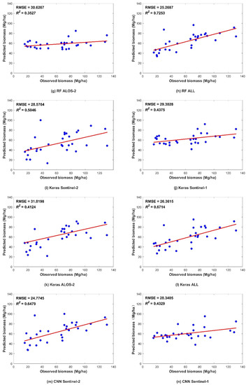 Figure 5 shows the R2 and RMSE values of the four models. In all four models, better performance was found with increasing data sources, followed by the performance using the Sentinel-2 data. This indicated that the vegetation index and biophysical predictors from Sentinel-2 were more helpful than those from other datasets. The SAR-derived predictors showed fewer effects than MSI predictors on the AGB predicted by the four models. In addition, compared to ALOS-2, Sentinel-1 performed slightly better. The L-band is known to be more sensitive than the C-band in AGB estimation. Nevertheless, we added SAR interference coherence to Sentinel-1 predicted variables, which increased the performance of the models with Sentinel-1 variables.