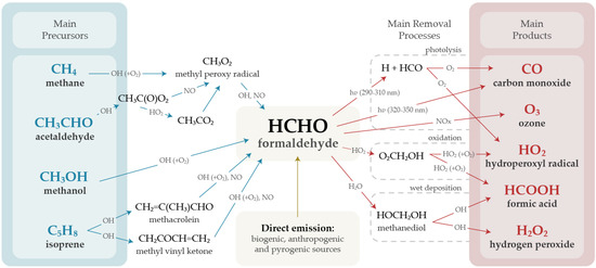 The short lifetime of formaldehyde is justified by the diversity of processes capable of removing this chemical species from the atmosphere [18]. The main ones are photolysis, by electromagnetic radiation at wavelengths from 290 to 310 nm and from 320 to 350 nm [19]; oxidation by OH and HO2 radicals [1]; and wet deposition, due to its strong electric dipole moment and consequent high solubility in water [20]. Figure 1 presents the main precursors of HCHO, intermediate species in production, removal processes and main products generated by such processes. Tropospheric ozone (O3) is an important product, and it is one of the main agents of photochemical smog; formic acid (HCOOH) and hydrogen peroxide (H2O2) are also relevant species generated as they contribute to acid rain in heavily polluted areas [21,22,23].