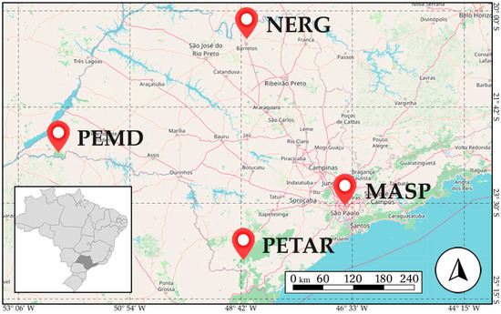 TROPOMI’s spatial resolution makes it possible to identify HCHO columns on the scale of cities, enabling the observation, if any, of the nuclei of pollution with high concentrations over individual urban centers [42]. The present work will focus on four areas of interest in the state of São Paulo: Metropolitan Area of São Paulo (MASP), Morro do Diabo State Park (PEMD), Alto Ribeira Tourist State Park (PETAR) and North of the State/Grande River (NERG) (Figure 2).