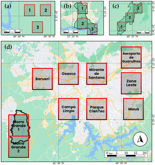 Geographic positioning of the three analysis windows on the NERG (a), three on the PEMD (b), three on the PETAR (c) and ten on the MASP (d). Analysis windows are regions that select HCHO columns for more in-depth analyses.