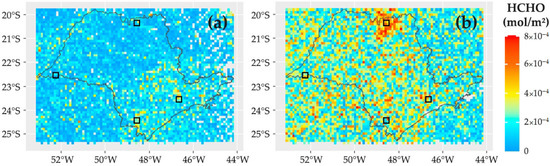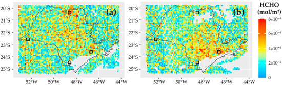 Satellite HCHO data (12 p.m.–4 p.m. local time) in São Paulo State: (a) 26 January 2020 (summer) and (b) 13 September 2020 (winter-spring). The black squares indicate the locations of the four areas of interest shown in Figure 2.