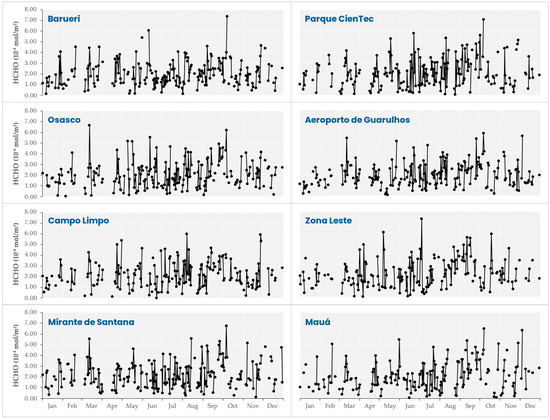 With the eight analysis windows on the densely urbanized region of the MASP, graphs were produced with the daily variation of HCHO concentrations throughout 2020 (Figure 5).