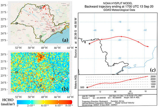 Data for 13 September from (a) INPE’S Queimadas Program, where the red dots represent fire outbreaks; (b) TROPOMI’s vertical columns of formaldehyde (12 p.m.–4 p.m. local time); and (c) HYSPLIT’s backtrajectory of air masses to the NERG area. The black squares indicate the locations of the four areas of interest showed in Figure 2.