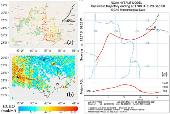Data for 28 September from (a) INPE’S Queimadas Program over Paraguay; (b) TROPOMI’s vertical columns of formaldehyde (12 p.m.–4 p.m. local time); and (c) HYSPLIT’s backtrajectory of air masses to the PEMD area. The black squares indicate the locations of the four areas of interest showed in Figure 2.