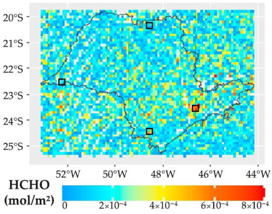 Data from vertical formaldehyde columns (mol/m²) were obtained from the TROPOMI spectrometer onboard the Sentinel-5P satellite, which makes one retrieval of HCHO columns per day over São Paulo State, always between 3 p.m. and 7 p.m. UTC or 12 p.m. and 4 p.m. local time [39]. This time window includes the hours of maximum incidence of solar radiation and also of maximum tropospheric ozone concentration on the day, which normally occurs around 3 p.m. in São Paulo [40]. The Level-2 product has a spatial resolution of km at nadir [41] and the instrument’s spectral bands cover the ultraviolet and visible regions at wavelengths from 270 to 500 nm [42], covering the spectral range attenuated by atmospheric formaldehyde (290 to 350 nm) [32,43].