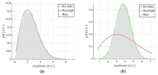 Figure 1 shows the obtained results concerning the amplitude values, both for Rayleigh (a), and Rice model (b). Histograms in gray represent simulated data, while the red and green curves are the Rayleigh and Rice functions (Equations (9) and (11), respectively), that result from a fit of the simulated data.