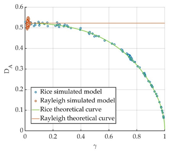 This equation establishes a direct relation between the DA and the coherence, under the hypothesis of Rician amplitude statistics. As will be shown in the next section, for GBSAR systems, in rural environments where low vegetation is present, this condition is met, and Equation (16) successfully reproduces the parameters relation.