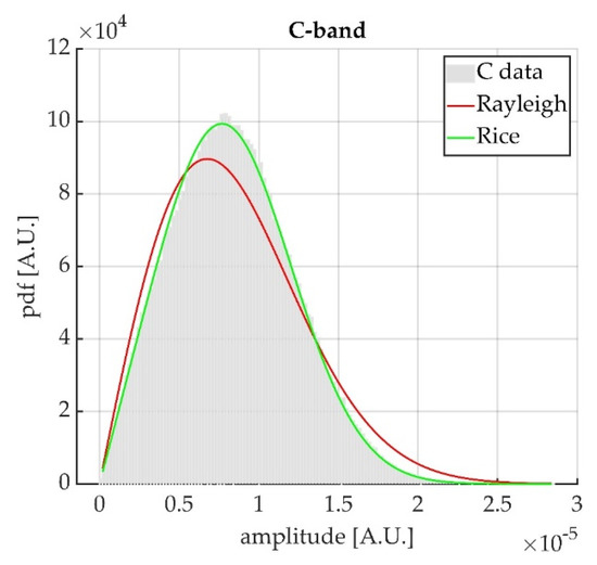 Figure 4 shows the histogram of signal amplitude values, obtained for the resolution cells in the region highlighted by the red box in Figure 3a. This region was a vegetated area characterized by meadows. The colored curves correspond to the theoretical distributions that best fit the experimental data. One can notice a good agreement between the experimental data and the Rice distribution.