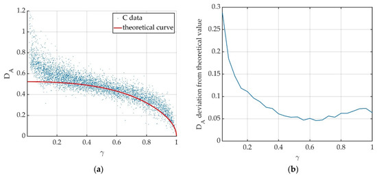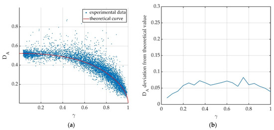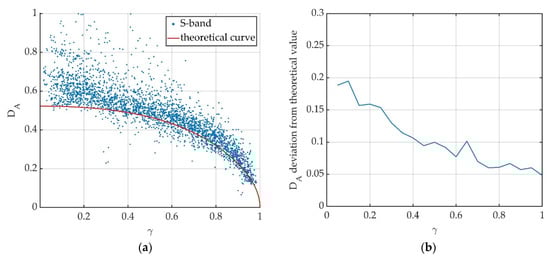 Results obtained for S-band data. (a) Relation between amplitude dispersion index DA and coherence γ of experimental data compared to the theoretical red curve, Equation (14). Each dot represents a resolution cell in the analyzed area. (b) Deviation of experimental DA values from theoretical ones.