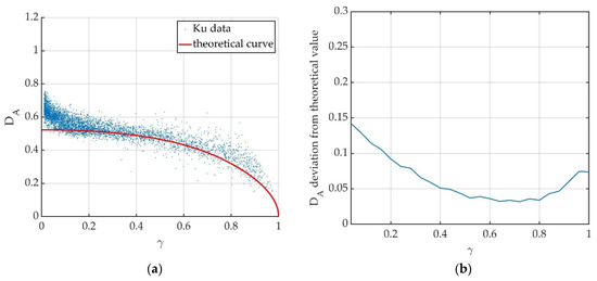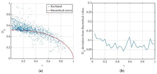 Results obtained for Ku-band data. (a) Relation between amplitude dispersion index DA and coherence γ of experimental data compared to the theoretical red curve, Equation (14). Each dot represents a resolution cell in the analyzed area. (b) Deviation of experimental DA values from theoretical ones.