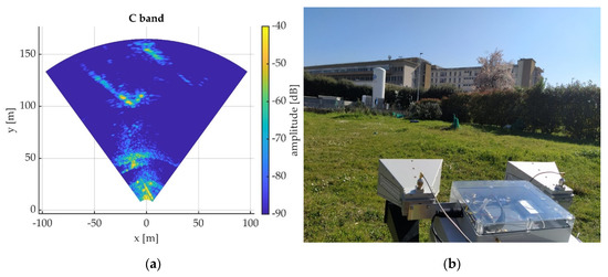 Finally, to further test the relation in an environment with different characteristics, a measurement series acquired in an urban scenario in the premises of the University of Florence is presented. In this case, the same GBSAR systems employed in the test site at Aquilonia, acquired images for 5 days. Figure 10 shows an amplitude image (a) and a picture (b) the illuminated scene. As can be observed, various kinds of targets are present in the area; namely, grass, some bushes, a tree, and buildings.