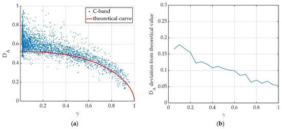 Results obtained for C-band data. (a) Relation between amplitude dispersion index DA and coherence γ of experimental data compared to the theoretical red curve, Equation (14). Each dot represents a resolution cell in the analyzed area. (b) Deviation of experimental DA values from theoretical ones.