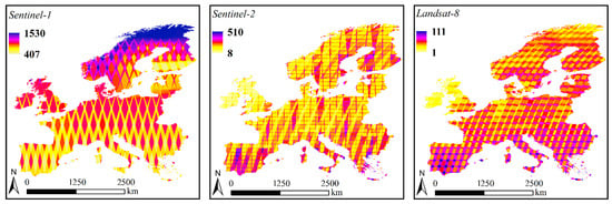 Landsat-8 is a multi-spectral satellite launched by the United States Geological Survey (USGS) in 2013. This study utilized Landsat-8-calibrated surface reflectance products with 11 spectral bands. The spectral bands included 30 m coastal aerosol (band 1), 30 m visible (band 2–4), 30 m Near Infrared (NIR, band 5), 30 m Shortwave Infrared (SWIR, band 6–7), 15 m panchromatic (band 8), 15 m cirrus (band 9), and 100 m thermal infrared (band 10–11) bands. Overall, 9331 Landsat-8 images were extracted in this study to mainly derive various spectral indexes for the LULC mapping task. Figure 2 shows the number of Sentinel-1/2 and Landsat-8 images from 2016 to 2021 above the entire continent of Europe, utilized as input data in the proposed methodology.