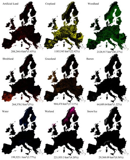 The European LULC map provides particular interests for various applications demanding generalized LULC details, such as agriculture, forestry, urban studies, and hydrology. Figure 6 highlights the extent of all classes across Europe with a 10 m binary mask. These maps confirm that the green natural areas, Woodland (40.27%) and Cropland (22.42%), are the most prevalent in Europe, similar to what was reported in CLC 2018. On the other hand, the Barren and Snow/Ice classes have the least coverage. This figure also indicates the distribution of each class. For instance, the high density of Woodland and isolated Shrubland areas could be detected in the northern regions and south western regions of Spain, respectively. Likewise, most Wetland areas were over the northern regions.