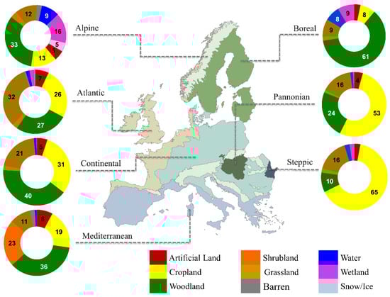 Figure 7 was also generated to supply more details of the distribution of LULC classes in seven biogeographical regions. Based on the results, Woodland is the dominant land cover across five ecozones, including Continental, Boreal, Alpine, Atlantic, and Mediterranean. Over the other two ecozones, Cropland covers more than 50% and 60% of Pannonian and Steppic, respectively. Moreover, the wet areas (i.e., Water and Wetlands classes) are mostly limited to the Alpine and Boreal regions, whereas they are rarely found in the Mediterranean region. It could be concluded that the provided results have a meaningful correlation with previous studies [].