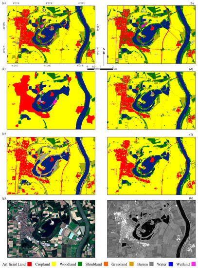 A zoomed area of the final ELULC10-2021 was selected to visually investigate some of the classification details. It should be noted that several classes of FROM-GLC10, WorldCover 10, and S2GLC maps were reclassified to make all maps comparable (see Table A1 in Appendix A). As shown in Figure 8, our classification map can accurately distinguish between different classes over a diverse area, significantly among easily confused classes, such as Cropland and Grassland. Additionally, the proposed methodology correctly identified trivial details of the selected subset in urban areas and borders of classes, along with satisfying a determined correlation to accurate existing maps, such as WorldCover 10 and ELC-10. Furthermore, the comparison of our results with the most recent LULC maps produced in 2020 (e.g., WorldCover 10 and Esri 2020) depicts the fact that urban and natural areas have been accurately classified in ELULC-10. For a further visual interpretation, the comparison of Figure 8a to Sentinel 10 m high resolution optical (Figure 8g) and SAR (Figure 8h) images ensures the reliability of the produced map.