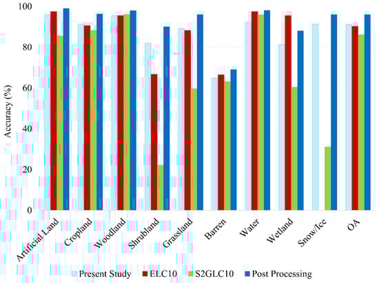 OAs and PAs of the nine LULC classes from the present study, ELC10, S2GLC10, and the present study (computed using [,] estimations) after post-processing.