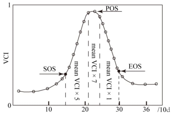 The phenological metrics (SOS, POS and EOS) were used to divide the growth stages of vegetation, so as to generate WVCI by linearly combining the mean values of VCI at different growth stages. In this work, the dynamic thresholds of SOS and EOS in the LP were set to 20% and 80% of the EVI amplitude, respectively. The reliability of the thresholds has been verified by some scholars [43,68] and phenological data recorded by ground stations [68]. However, due to inconsistent data sources and time periods, the multi-year average SOS and EOS values obtained by various scholars showed some differences in space. The spatial patterns of the multi-year average SOS and EOS in this study were consistent with the results of most scholars [43,68,69,70], but EOS was slightly different from their results in the size of the value. Studies by many scholars [51,71,72] have shown that the SOS of vegetation in the LP tends to advance, EOS tends to delay, and the growing season becomes longer. As a result, the differences and variations in phenological parameters may lead to the deviations in WVCI to a certain extent.