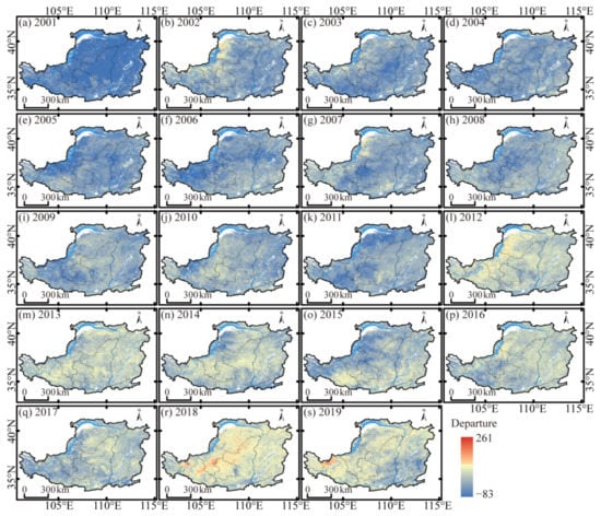 Spatial pattern of the departure percentage of WVCI across the Loess Plateau from 2001 to 2019.
