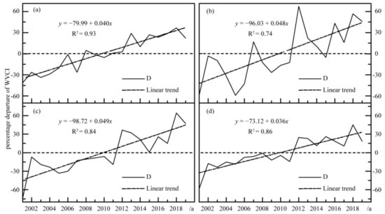 Temporal variation in D time series for the (a) forest, (b) shrub, (c) grassland and (d) farmland in the Loess Plateau from 2001 to 2019. ‘D’ represents the departure percentage of WVCI.
