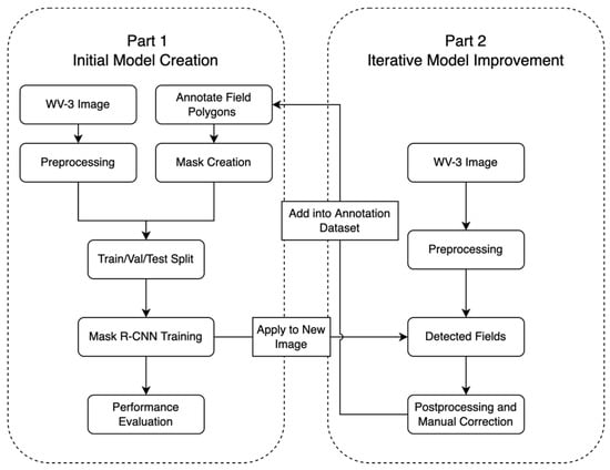 Deep learning methods require sufficient annotated data to train end-to-end models, especially for sophisticated deep learning architectures such as Mask R-CNN. In the context of mapping agricultural fields or parcels, public datasets are useful, such as the Land Parcel Identification System [8] and available cadastral data [4]. These datasets, however, are usually not available in smallholder farming systems. To overcome this limitation, other studies have used manual annotation of field boundaries based on the visual interpretation of imagery or ground surveys, but both methods are time- and cost-intensive, resulting in datasets that are typically limited to a relatively small region. Some studies have relied on crowdsourcing methods to digitize field boundaries [26]; however, error may be introduced due to high variation in experience and skill in interpreting satellite imagery [27]. One possible way to reduce such challenges is to develop an iterative approach that combines the digitization of field boundaries with the ability of deep learning methods to automatically learn features. Such an approach may allow for the development of accurate models using fewer manually collected field boundaries. Furthermore, it is possible that such deep learning methods are generalizable across regions, reducing the amount of training data needed to map field boundaries at large spatio-temporal scales [28]. We assessed the ability of an iterative approach to improve model accuracy while reducing model training time, and also examined the generalizability of our model to new regions where it had not been trained.