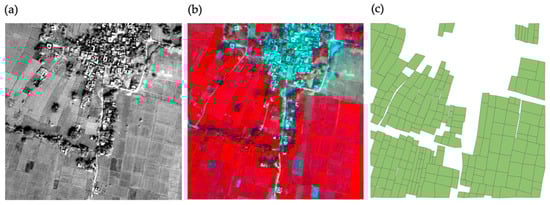 (a) Example of panchromatic imagery, (b) multispectral imagery, and (c) digitized field polygons for one 1024 × 1024 pixel tile.