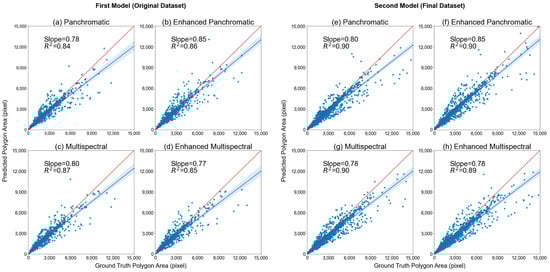 Scatterplots of ground truth mask area (in pixels) on the x-axis versus delineated mask area (in pixels) on the y-axis. Only correctly delineated field masks are included. Plots (a–d) represent results for the original model across WV-3 image types in Bihar, and plots (e–h) represent results for the final model across WV-3 image types in Bihar. Blue lines with shading represent the linear regression line with 95% confidence intervals, and red lines represent the one-to-one line.