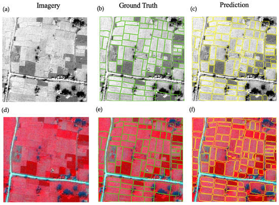 One example of a 512 × 512-pixels WV-3 unenhanced tile in Uttar Pradesh. Panel (a) shows the original panchromatic image, (b) shows the panchromatic image with ground truth, (c) shows the enhanced panchromatic image with delineated field boundaries, (d) shows the original multispectral image, (e) shows the multispectral image with ground truth, and (f) shows the enhanced multispectral image with delineated field boundaries. Results are shown for the final model, which included the iteratively collected data. Green lines represent ground truth field boundaries, and yellow lines represent predicted field boundaries.