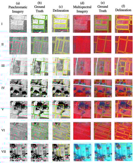 Overall, there were several common delineation issues in our results (Figure 5, Figure 6 and Figures S4 and S5). A common delineation error of under-segmentation occurred when several fields were classified as one field due to obscured or marginally visible boundaries (Figure 6I and Figure S5I). There were also cases of over-segmentation, where one field was detected and delineated as two or more fields (Figure 6II, columns b and c). In cases of high within-field crop variation, the model mistakenly identified this variation as a boundary edge when using multispectral imagery (Figure 6III, columns e and f), whereas the models using the other three imagery types were better able to delineate the field boundaries (Figure 6III and Figure S5III). Occlusion also influenced results. For example, trees at field edges often caused boundary delineation issues (Figure 6IV and Figure S5IV). In addition, the model sometimes could not detect fields accurately at the edge of image tiles (Figure 6V and Figure S5V; upper and right edges are the image edges). Finally, all models failed to detect narrow and long fields when the image tiles consisted primarily of such fields (Figure 6VI and Figure S5VI) and produced false positives in unplanted fields, where it was difficult to visually observe boundaries (Figure 6VII and Figure S5VII).