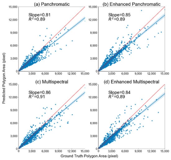 Table 5 shows the mean IoU values, the mean ground truth area, and the mean delineated area for all of the correctly delineated fields. Table S3 shows the mean area of all ground truth field masks and the mean area of all delineated field masks. Across all models, the delineated mask areas were smaller than the ground truth areas (Table 5 and Table S3). Unsurprisingly, plots comparing ground truth and correctly delineated field polygons indicated improved delineation when additional training data were used. The initial models resulted in mean IoU values of 0.80, slopes that ranged from 0.77 to 0.85, and R-squared values that ranged from 0.84 to 0.87 (Figure 4) for all of the four image types. In comparison, the model trained using the final dataset performed better, with IoU values ranging from 0.83 to 0.84, slopes ranging from 0.78 to 0.85, and R-squared values ranging from 0.89 to 0.90 (Figure 4). Among the four types of imagery used, the model using enhanced panchromatic imagery showed the best performance.