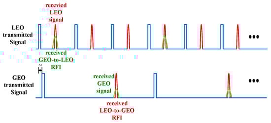 Geosynchronous (GEO) SAR has great advantages such as large coverage and a short revisit time, providing rapid response and continuous observation of disaster areas [27,28,29,30,31]. However, due to its large coverage, GEO SARs are prone to observing the same area as low earth orbit (LEO) SARs simultaneously, potentially resulting in strong main lobe coupling between the two systems. As a result, GEO SAR signals can be received by a LEO SAR. Similarly, LEO SAR signals may be received by a GEO SAR, deteriorating SAR images if they have the same signal frequency. Furthermore, the large coverage and short revisit time of GEO SARs may increase the probability of RFI with LEO SARs.