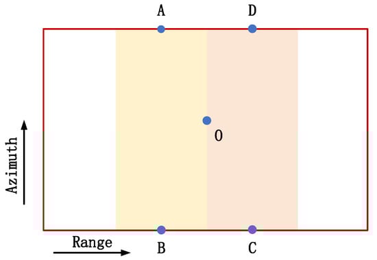 When the beam coverage overlaps, RFI between GEO SARs and LEO SARs may occur. The beam coverage of GEO SARs is usually much larger than that of LEO SARs. Therefore, only LEO SAR beam coverage should be considered. As shown in Figure 3, the red frame represents the beam coverage of a LEO SAR (the antenna of LEO SARs is usually rectangular). Point A, B, C, and D are illuminated by both the LEO SAR and the GEO SAR at the same time. Thus, the RFI, which is transmitted by the GEO SAR and scattered by these points, would affect the LEO SAR. The RFI scattered by point A produces a yellow interference zone after the SAR processing. Since the GEO-to-LEO RFI scattered by point A and point B has the same parameter for (9), according to the principle of SAR, point B, located in the same range cell as point A, would produce the same interference zone as point A. The same is true for point C and D. Point O is at the junction of the yellow interference zone (generated by A and B) and the pink interference zone (generated by C and D). Based on the geometry, the interference zone formed by all the units in zone ABCD will affect cell O. Assuming there are N cells in total, the RFI power received by unit O can be written as , where is the RFI power of the ith cell.