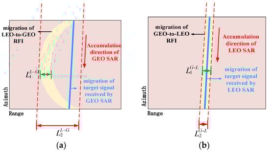 According to Figure 3, is related to the size of the interference zone. Like GEO-to-LEO RFI, the azimuth length of corresponds to the azimuth direction length of the LEO SAR beam coverage on the ground. However, the range direction length of the interference zone generated by the LEO-to-GEO RFI is different from that of the GEO-to-LEO RFI (written as (11)). As shown in Figure 4, the LEO-to-GEO RFI can have a much larger range migration than GEO SAR signals due to the long integration time of the GEO SAR and the different velocity between the GEO SAR and the LEO SAR. However, there is little difference on the migration between the LEO SAR and the GEO-to-LEO RFI due to the short integration time of the LEO SAR. When the Back Projection (BP) algorithm is adopted, the RFI will be accumulated along the migration direction of the SAR signals. Thus, the interference zone generated by the LEO-to-GEO RFI will spread in the range direction due to its inconsistent migration direction with the GEO SAR signals, while the interference zone generated by the GEO-to-LEO RFI will remain unchanged due to its similar migration direction with the LEO SAR signals.