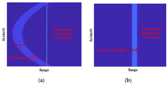 Range compression result. (a) the RFI which is transmitted by the LEO SAR, scattered by the scene center, and received by the GEO SAR and the target echo which is transmitted and received by the GEO SAR; (b) the RFI which is transmitted by the GEO SAR, scattered by the scene center, and received by the LEO SAR and the target echo which is transmitted and received by the LEO SAR.